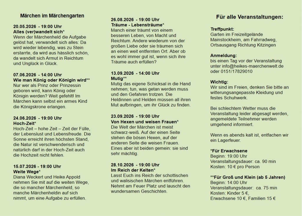 Geschafft! Mein Flyer für den Märchengarten 2026, der dieses Jahr sehr lange auf sich warten ließ, ist fertig und befindet sich aktuell im Druck. Da ich feststellen musste, dass das Wetter im Winter einfach unberechenbar ist, habe ich entschieden, nur noch von O bis O im Märchengarten zu erzählen, also von Ostern bis Oktober. In diesem Jahr allerdings beginne ich erst im Mai, weil ich im April in der katholischen Kirche in Mainstockheim jüdischen Märchen erzähle.