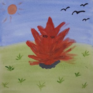Mit viel Enthusiasmus schnappte ich mir einen Keilrahmen, Pinsel, Palette und Farben und machte mich an mein erstes Werk, das im Zeichen des Feuers stand. Ich war fleißig am werkeln und am Ende der Veranstaltung hatte ich immerhin drei von vier Bildern geschafft. Zugegeben, es gab weit schönere Bilder als meine, aber ich bin trotzdem zufrieden, denn schließlich bin ich ein Nicht-Malkünstler. Gefallen sie Euch?