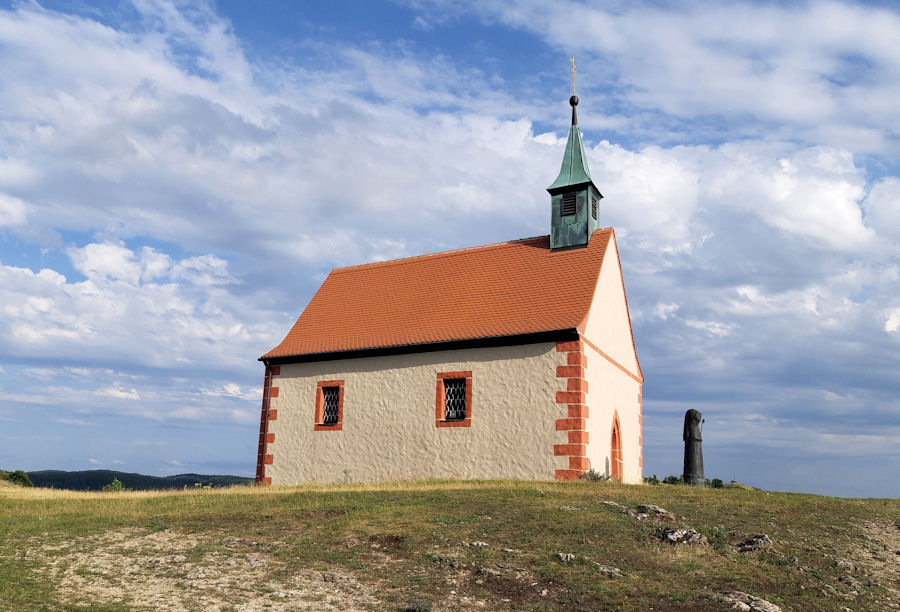 Äh, ja, einen kleinen Umweg… Das bedeutete, zurück zum Bergkreuz, den Berg ganz hoch und oben über die Walpurgis-Kapelle wieder hinunter. Blöd bloß, dass es ziemlich warm und wir für eine Wanderung nicht ausgerüstet waren, sprich: Wir hatten kein Wasser für den Hund dabei. Glücklicherweise hatte ich mein Wasser nur zur Hälfte getrunken und Luna säuft mir zur Not auch aus der hohlen Hand.