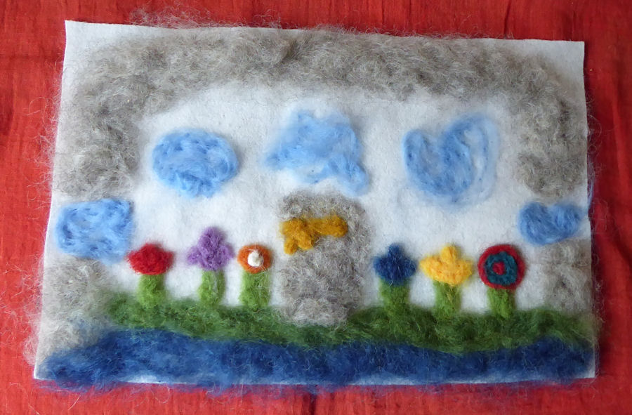 Am anderen Tag erzählte uns Hella Rissmann eine etwas gekürzte Version der Regentrude von Theodor Fontane. Danach packte sie Filzplatten und jede Menge Märchenwolle aus. Unsere Aufgabe: Filze in der Nadelfilztechnik ein Bild mit dem Motiv, das dich im Märchen am meisten angesprochen hat – oder – bringe die vielen Farben des Märchens auf das Bild. Wir waren alle mit Feuereifer dabei und es sind wunderschöne Filzbilder entstanden. Obwohl ich schon gefilzt habe – auch in Nadelfilztechnik – wäre ich nie auf die Idee gekommen, ein Bild zu filzen. Es hat aber so viel Spaß gemacht, dass ich überzeugt davon bin: Es ist nicht das letzte seiner Art.